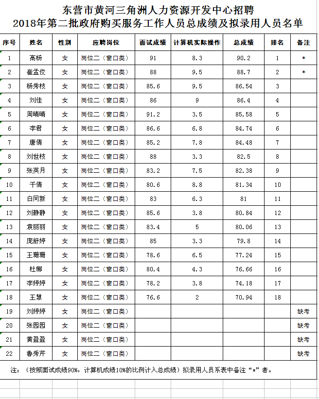 根據(jù)本次招聘活動的安排,現(xiàn)將東營市黃河三角洲人力資源開發(fā)中心招聘2018年第二批政府購買服務(wù)工作人員的總成績及擬錄用人員名單予以公布。望擬錄用人員按照統(tǒng)一規(guī)定和要求辦理相關(guān)手續(xù)。