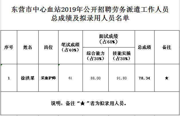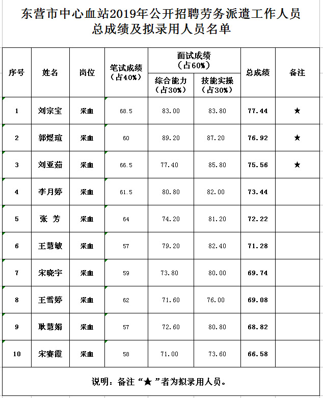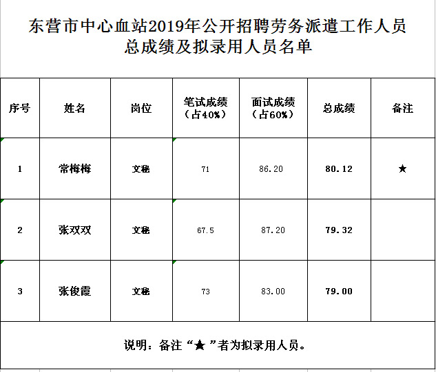 關(guān)于公布東營(yíng)市中心血站2019年公開(kāi)招聘勞務(wù)派遣工作人員總成績(jī)及擬錄用人員名單的通知