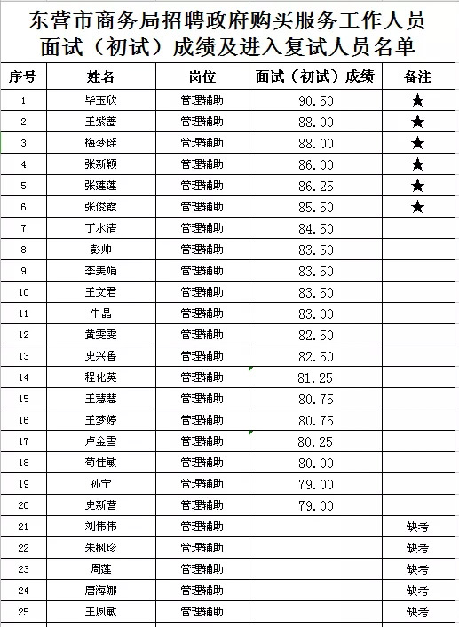 根據(jù)有關(guān)規(guī)定要求和本次招聘活動的統(tǒng)一安排,現(xiàn)將《東營市商務局招聘政府購買服務工作人員面試(初試)成績及進入復試人員名單》予以公布,請查閱。